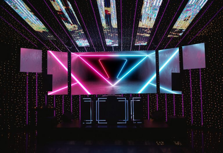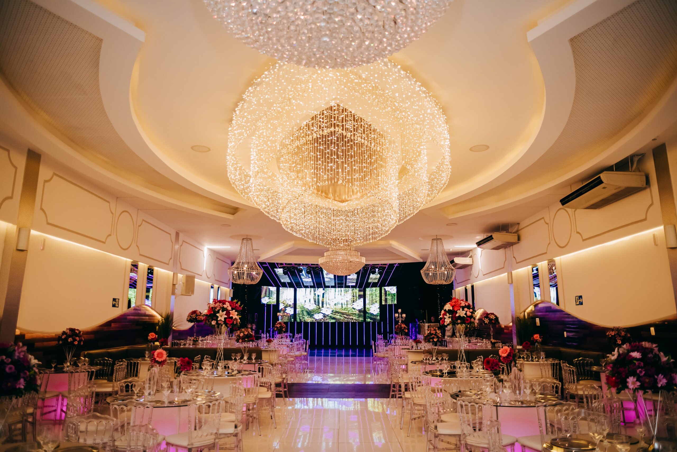 Sala com detalhes arquitetônicos impressionantes, espelhos em todas as paredes, iluminação de LED personalizável e uma incrível árvore interativa em LED.