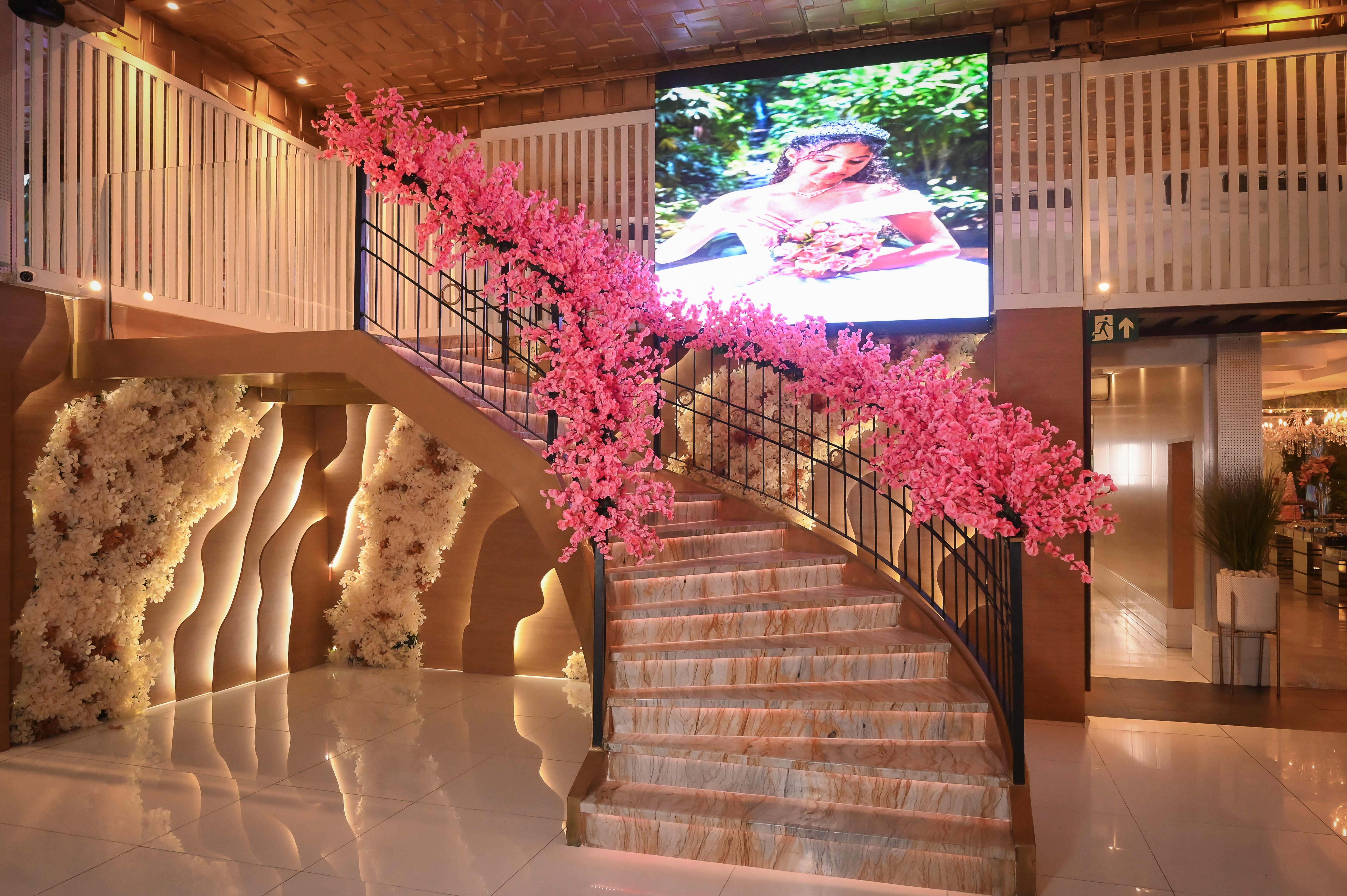 A mais recente novidade da nossa casa de festas une sofisticação e tecnologia. Nossa escada foi projetada com degraus iluminados por LEDs, criando um efeito visual deslumbrante e moderno